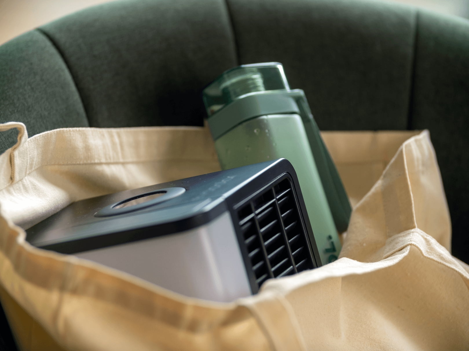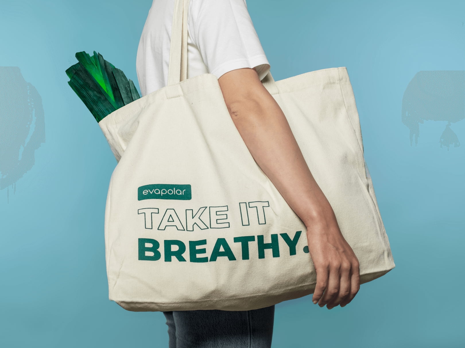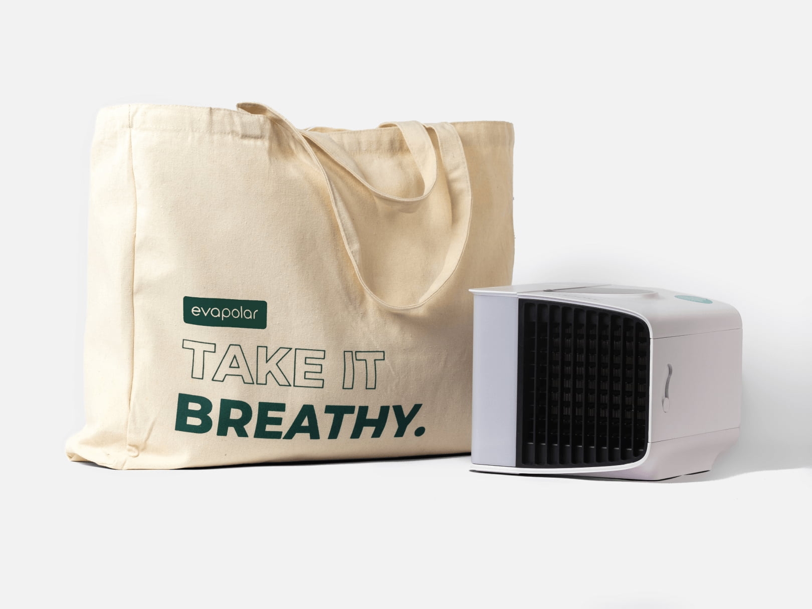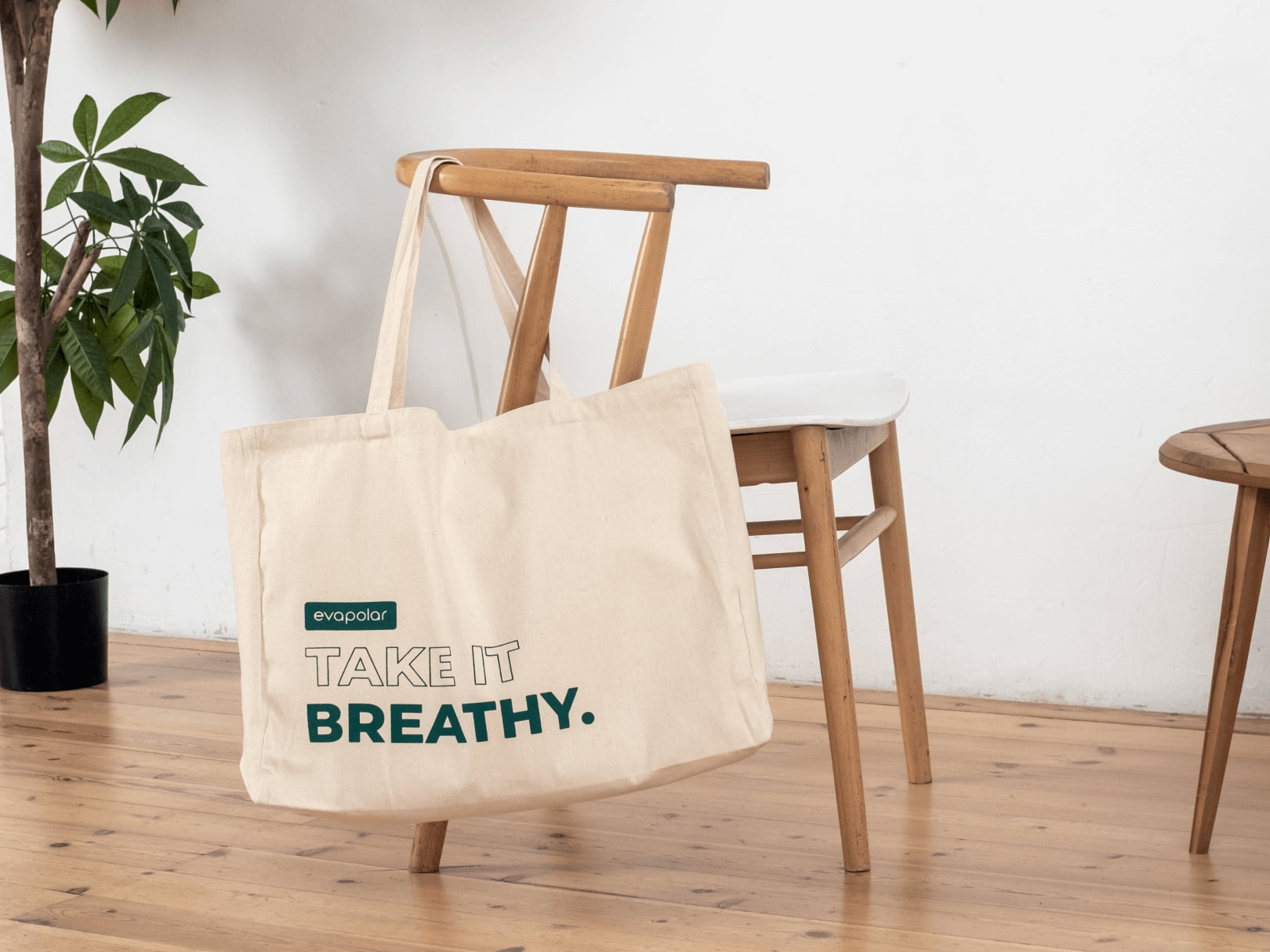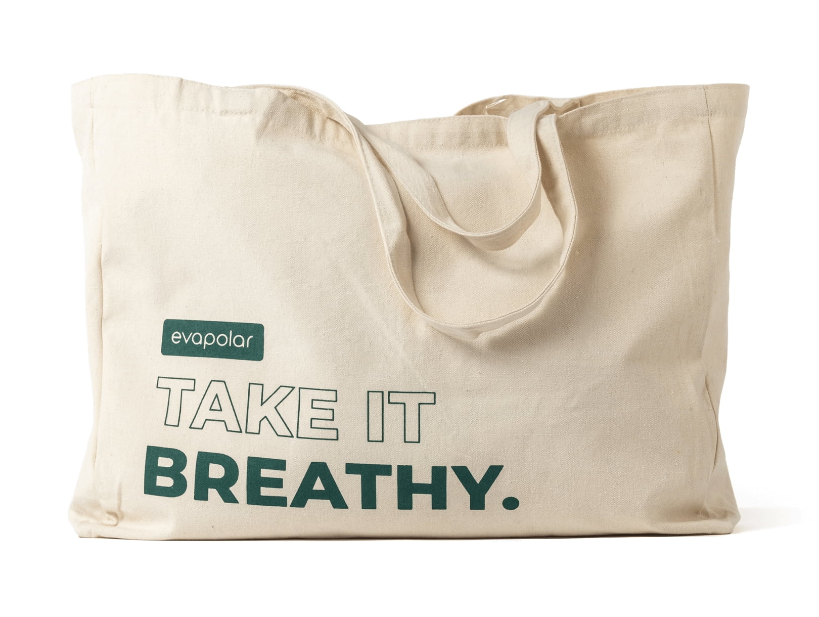 Un diseño simple y un print elegante se unen en nuestra bolsa de algodón premium. Pon tu Evapolar portátil en esta bolsa y viaja a donde quieras con ella