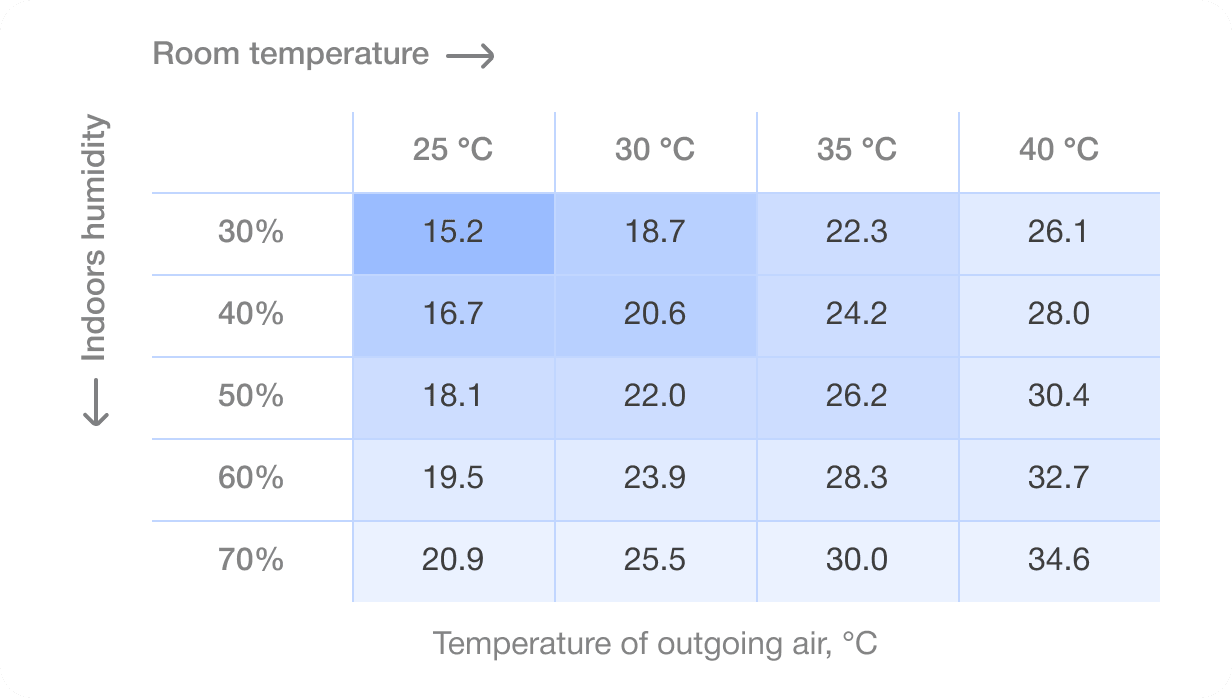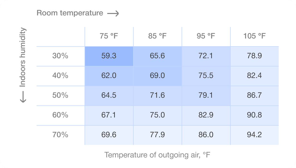 El potencial de enfriamiento de la refrigeración evaporativa depende de la humedad relativa de la habitación y de la temperatura inicial. Utilice la tabla siguiente para comprender la relación entre la humedad del aire y la caída de temperatura.